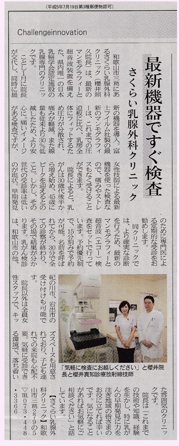 院長がわかやま新報社の取材を受けました。女性技師による最新機器を使った検査なので痛みやストレスもなく痛くないマンモグラフィ検査を受けて頂けることを詳しく掲載頂きました(2019年4月25日掲載)。