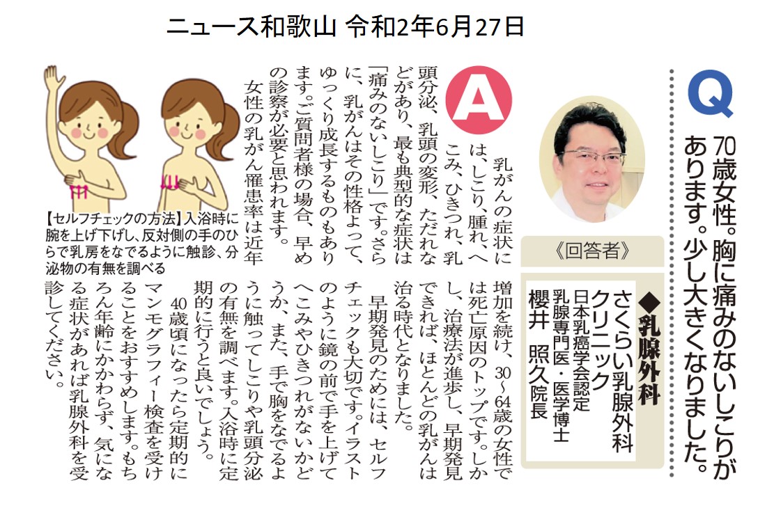 ニュース和歌山新聞(2020年6月27日号)おしえてマイドクターに、乳がんについての記事を掲載頂きました