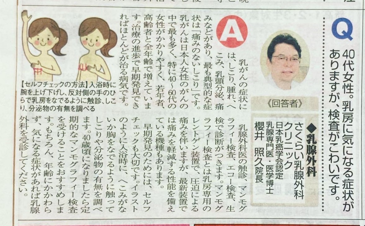 ニュース和歌山新聞(2021年2月27日)に、乳房に何か症状がある患者様が来院された際の、検査内容について説明させて頂きました。