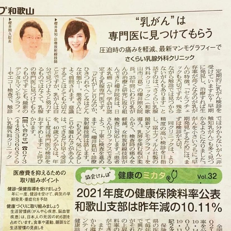 3月27日号のリビング和歌山新聞に、当院についての記事が掲載されました。乳がんは自己検診だけでは見つからない、シコリを作らないタイプもあります。早期発見のため、定期検診を受けることをおすすめます。