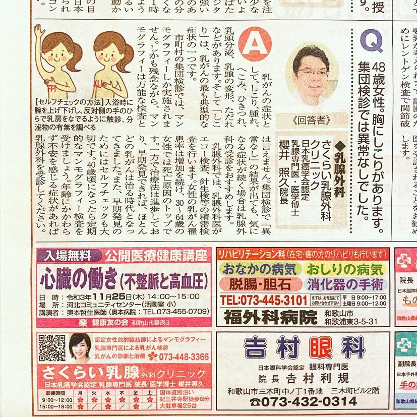 10月23日のニュース和歌山新聞に記事を掲載頂きました。”48歳女性、胸にしこりあり、集団検診では異常なし”。ご覧頂ければ幸いです。