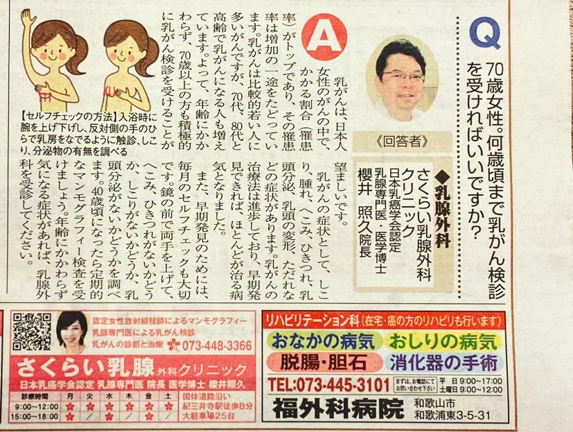 ニュース和歌山新聞に当院の院長の記事が掲載されました。時々患者様から『この年になっても乳がん検診をした方がいいですか』との質問を受けます。