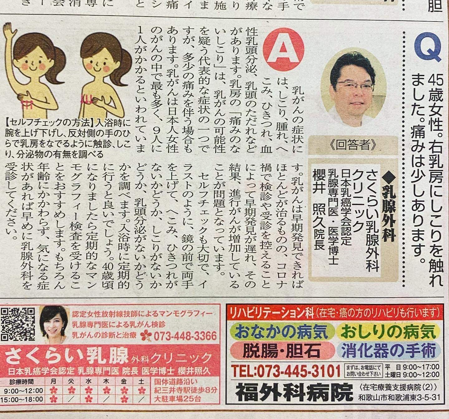 ニュース和歌山新聞に当院の院長の記事が掲載されました。乳がんの代表的な症状として、『痛みのないしこり』がありますが、痛みを伴うしこりで来院されて、乳がんが見つかることもこれまで経験しています。痛みの有無にかかわらず『しこり』の症状は注意すべき症状です。乳がんに罹患する女性は年代を問わず増加しておりますので、気になる症状がなくても年に一度の検診はおすすめさせて頂いております。また、年齢にかかわらず気になる症状がある方はできるだけお早い受診をお願いいたします。