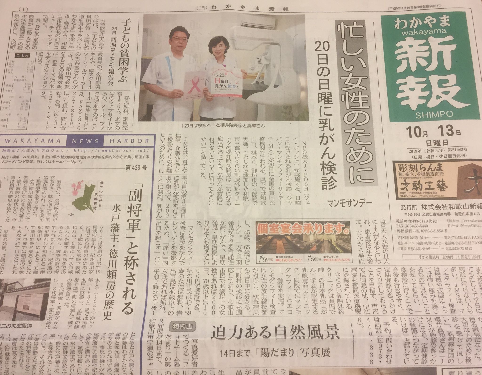 わかやま新報社様に(2019年10月13日掲載)、10月20日(日曜日)に本年より当院も参加するジャパンマンモサンデーについて、和歌山新報様に取材頂き、1面に掲載頂きました。