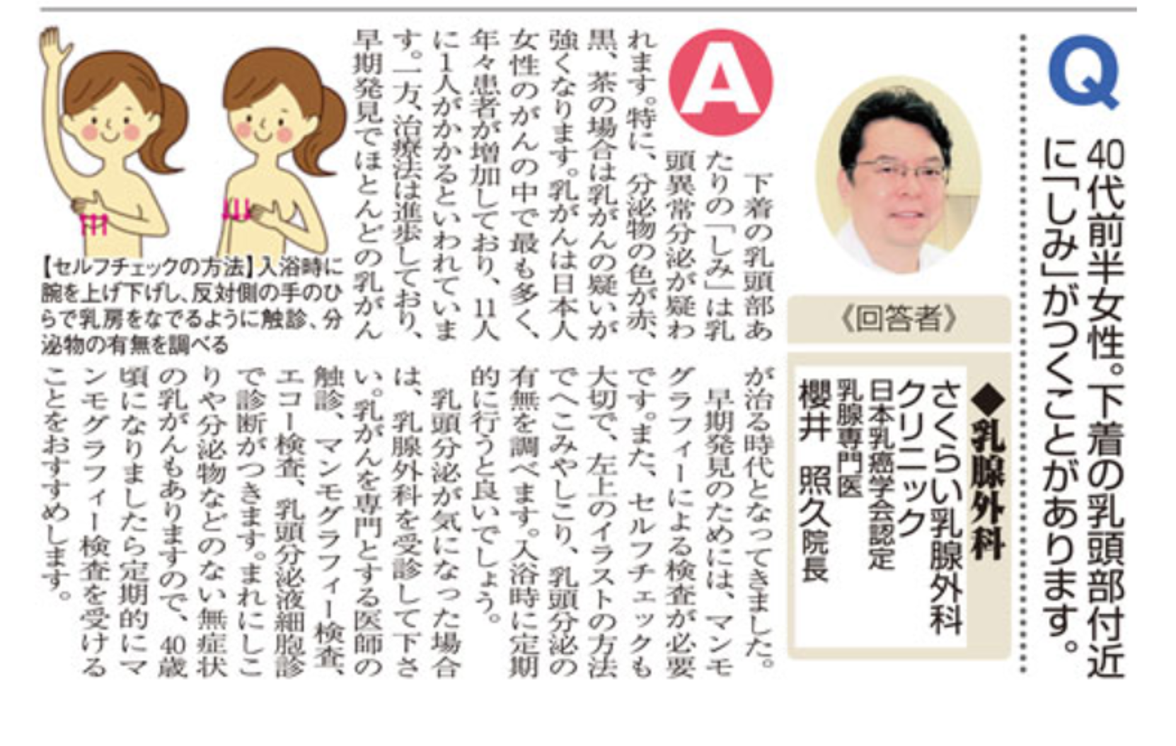 ニュース和歌山新聞(2019年10月26日号)おしえてマイドクターに、乳がんについての記事を掲載頂きました。乳頭分泌と乳がんなどの内容につき解説させていただきました。