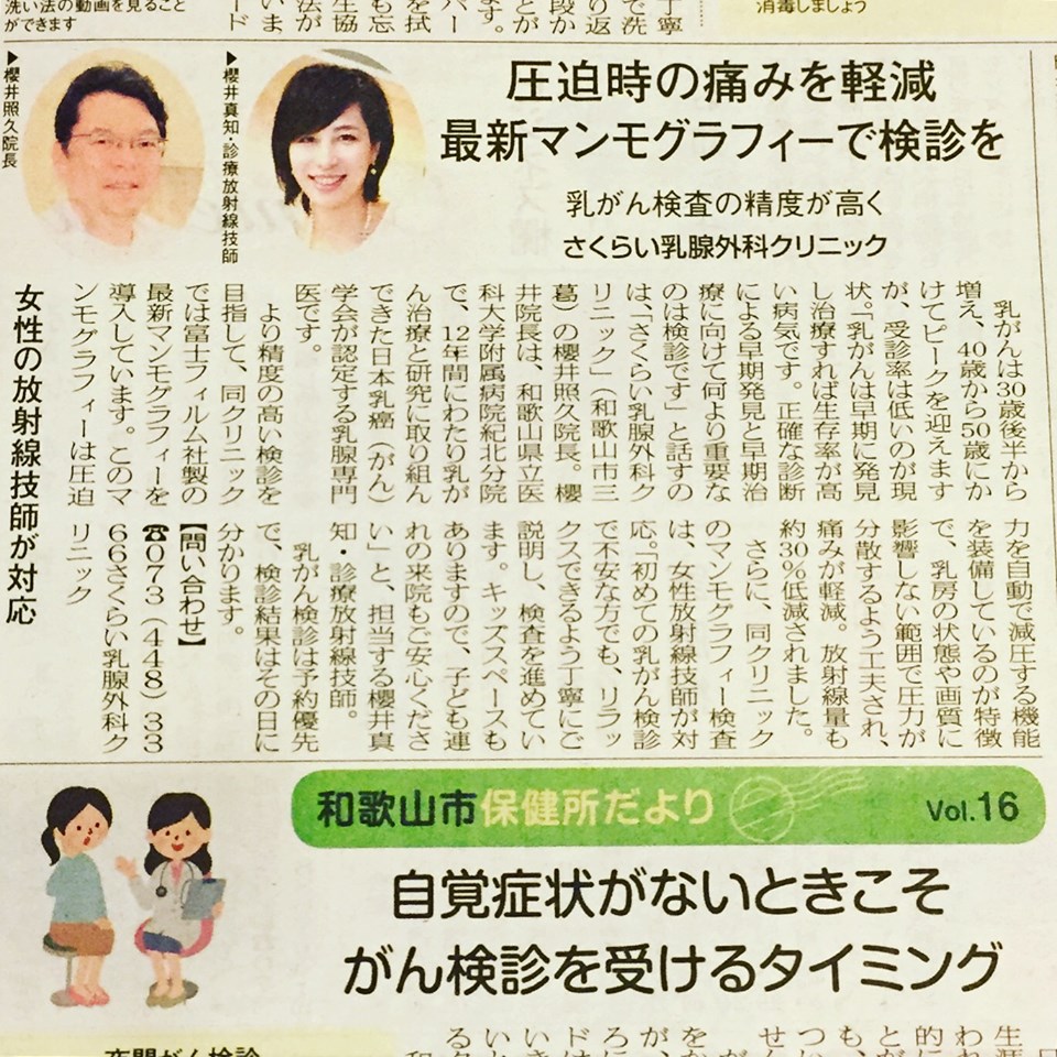 リビング和歌山2020年1月25日号に掲載頂きました。当院は高画質、被爆低減、圧迫の痛みを軽減する「なごむね」搭載の最新マンモグラフィーを導入していることを紹介させて頂きました。マンモグラフィーは痛いので嫌だという方も大丈夫です。