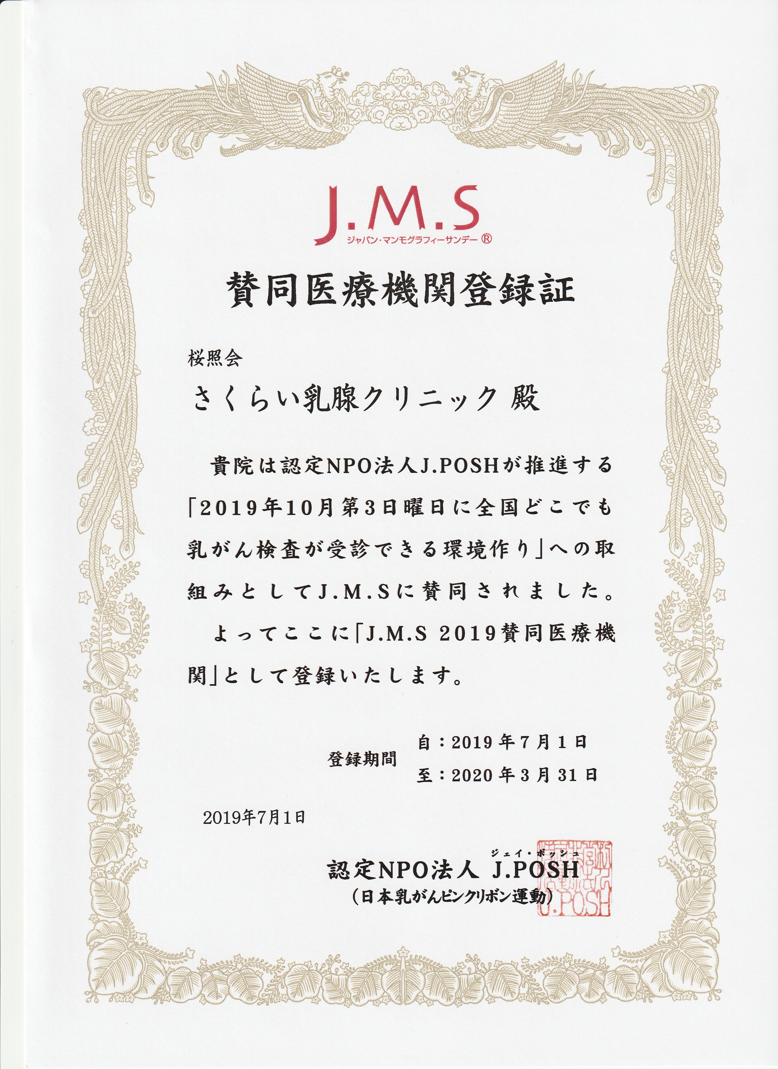 2019年10月20日(日曜日、ジャパンマンモグラフィーサンデー)に予約先着順にて乳がん検診の受付を承ります。ジャパンマンモグラフィーサンデー(J.M.Sプログラム)は多忙な平日を過ごしておられる女性の皆様のための日本乳がんピンクリボン運動(J.POSH)の取り組みです。