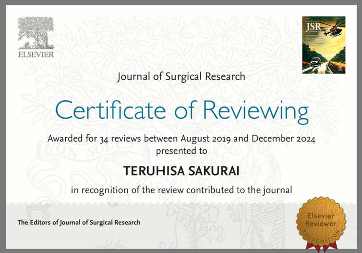 2019年より2024年に英文学術医学雑誌(Journal of surgical research社) に投稿された論文34編の査読をしたことの賞状を頂きました。有名な学術雑誌からの査読の依頼は大変光栄なことであり、今後も貢献していきたいと思います。
